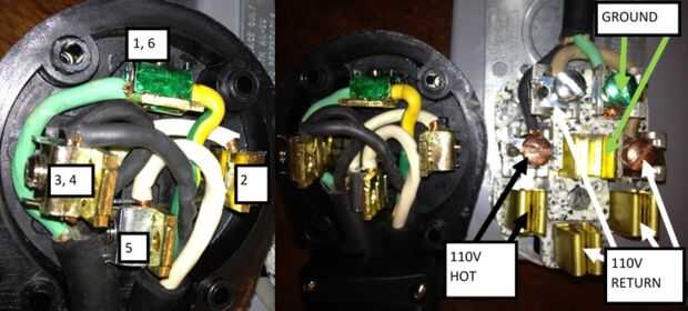 La foto de la derecha muestra cómo conectar un receptáculo NEMA 14-50 para convertir un enchufe de 110V por lo que puede alimentar la unidad. Tenga en cuenta que el retorno está conectado a dos terminales. El otro extremo sólo ganchos a un enchufe de 110V estándar (no usa este cable para cualquier dispositivo).