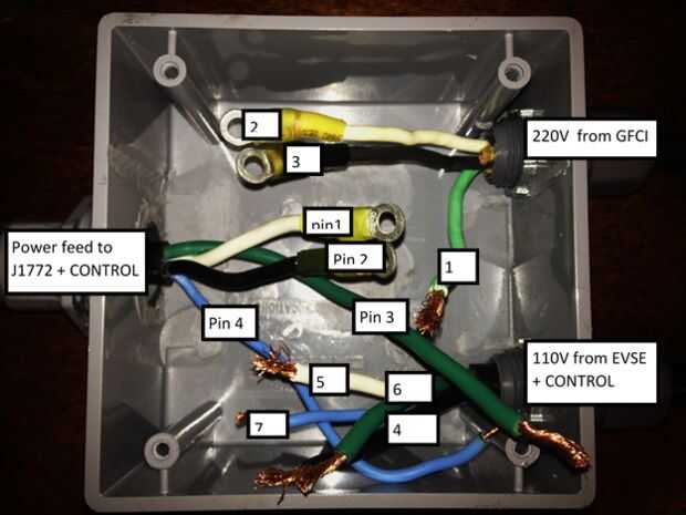 Conectar 220V GFCI cuerda en la parte superior del impermeable caja, un alivio de tensión. Conecte la caja EVSE cuerda en la parte superior del impermeable caja, con un alivio de tensión. Conecte el cable de J1772 en fondo de impermeable caja, con un alivio de tensión. Usé 1/2 pulgada tensión relieves que tenía para escariar a 1/2 pulgada para obtener los cordones de ajuste a, ¾ pulgadas pueden funcionar mejor.