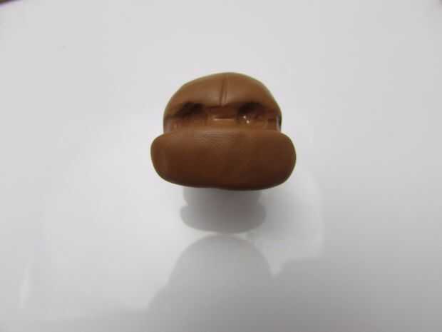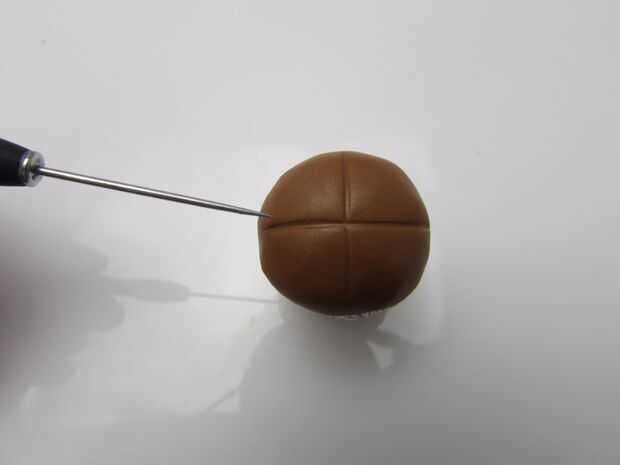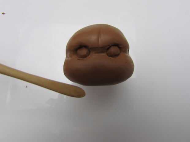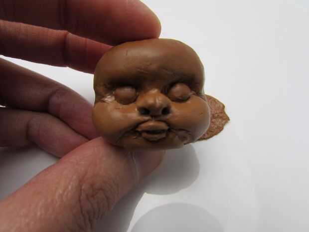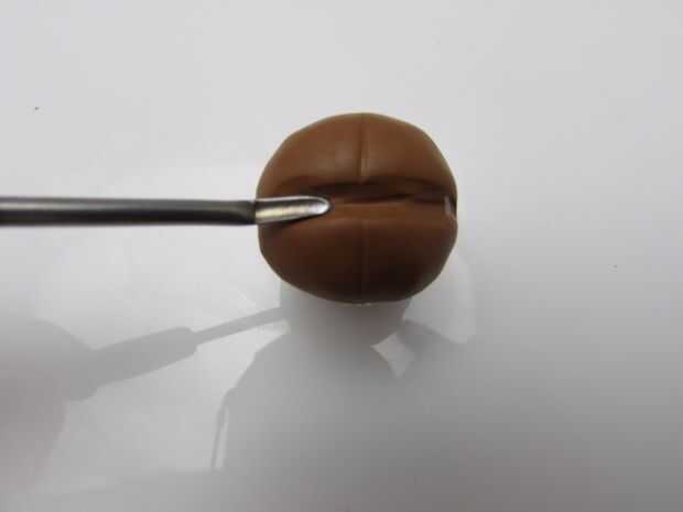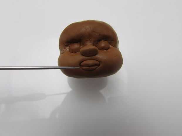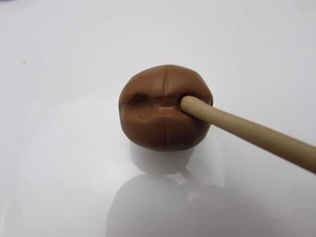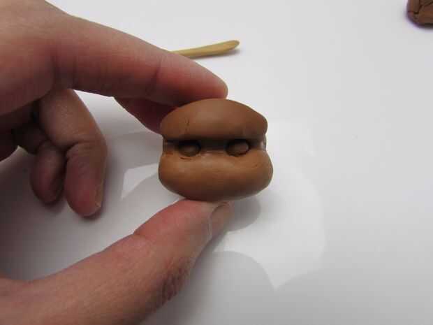 Pulse un trozo de arcilla polimérica de color marrón en el talón y una forma redonda para el rostro sin cubrir el grano entero. (imagen 1) Se quitar el grano después de que la cara se cuece al horno.