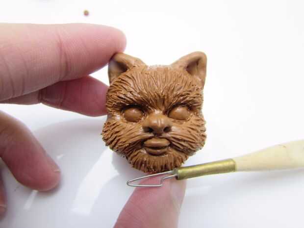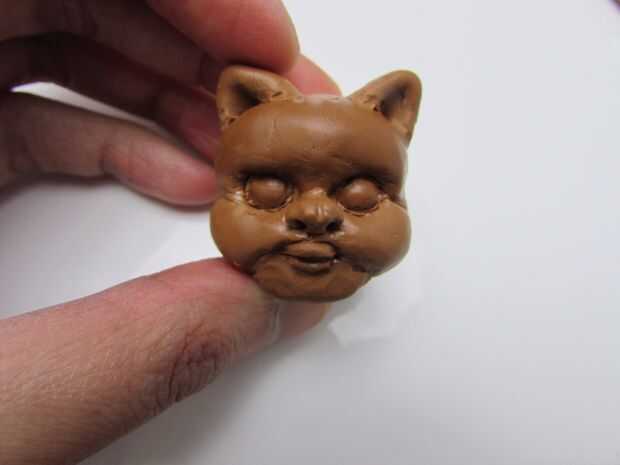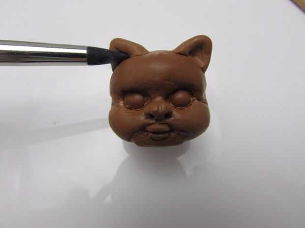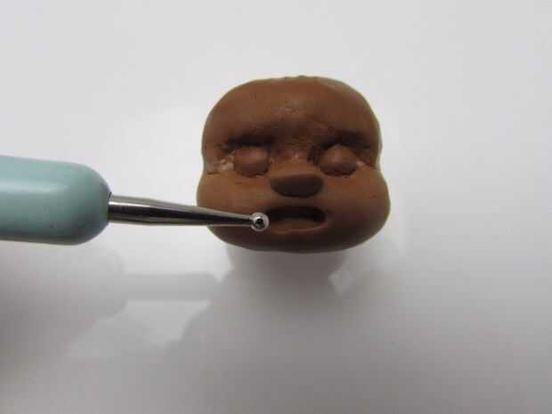 Para esculpir la cara de un Ewok, marque las líneas centrales vertical y horizontal. (imagen 2) Hacer un guión sobre la línea horizontal y pulse una herramienta en forma de bola para los zócalos del ojo bola. (imágenes 3 y 4) Agregar una forma oblonga aplanada por debajo y por encima de los zócalos del ojo y mezcla las costuras para crear la parte inferior de la mitad de la cara y la frente. Colocar 2 bolitas en las tomas para los ojos. (5-8 imágenes) Agregar una forma triangular de la nariz y con una aguja hacer un guión para la boca. (imagen 9) Coloque un pedazo oblongo pequeño que cabe en la boca y con una herramienta de la aguja hacer una línea de los labios superiores e inferior y aplicar sangría a los lados de los labios con un lápiz de bola. (imágenes 10 y 11) Presione los lados de la boca para delinear las mejillas y la barbilla. (imagen 12) Utilice una herramienta de bola a sangrar la nariz y ligeramente haga una línea vertical encima de la nariz. (imagen 13) Para los oídos, hacer 2 formas triangulares, mezcla encima de la cabeza y ahuecar con un modelador de silicona. Añadí más arcilla en la zona de la barbilla y había mezclado las costuras. (imágenes 14 y 15) A veces es necesario agregar pedacitos de arcilla para hacer las cosas bien. Textura de la piel en los grupos primero, luego con una herramienta más pequeña refinar la piel. (imágenes 16 y 17)