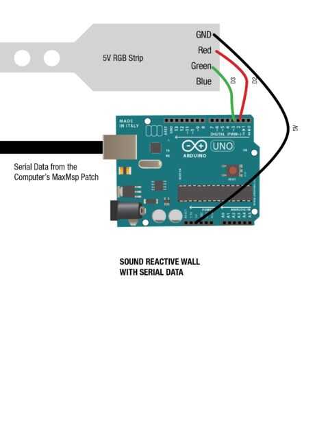 Para la versión de avance más, asignar el sonido MaxMsp y aplicar el filtro de paso bajo y filtro de paso alto para obtener diferentes colores, luego enviar la señal via puerto serie mediante cable FTDI para Arduino o cualquier tablero de Atmega. El microcontrolador Arduino lee el número y el mapa del valor para el número. Si está usando la arduino UNO o LEO, entonces no necesitas el cable FTDI, ya pueden hablar en Serial de Hardware.