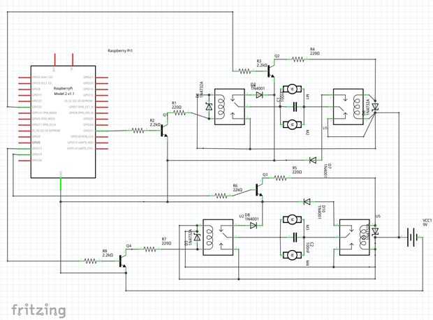 Tal vez la forma más simple, más segura y sencilla de controlar los motores utiliza 2 sistemas de 4 módulos de relé.