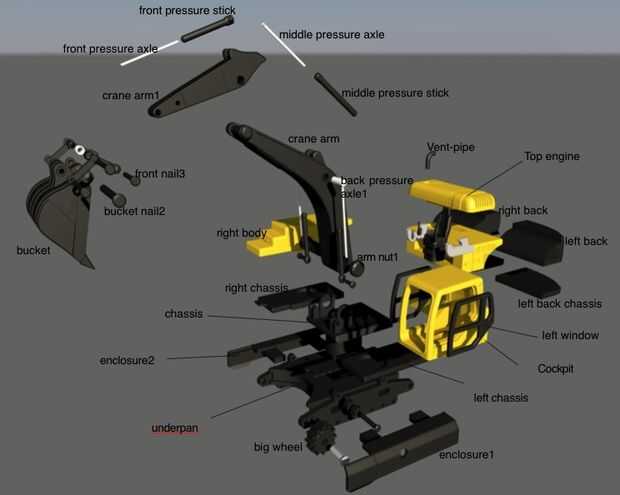 El cubo de excavación fue producto de un proyecto de diseño basado en un enganche rápido y un balde para una excavadora Hitachi EX130. Mientras que el cubo y enganche rápido diseñó parte por parte para fabricación la excavadora fue elaborada simpleme
