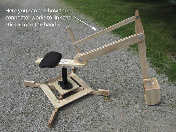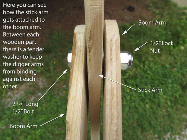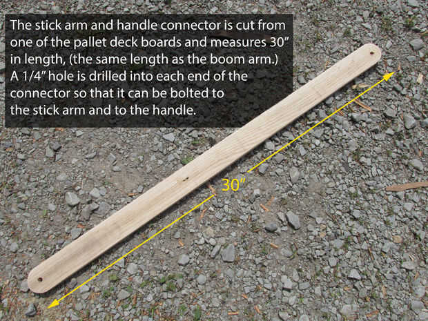 Una vez que el brazo de palanca se une a la varilla que se necesita para crear un conector para conectar el brazo de palanca a la manija que se instaló con los brazos. Este conector es solo una simple 30" longitud de tablero de cubierta de la plataforma y debe instalarse para que cuando usted empuja la manija hacia adelante el cubo se mueve hacia usted y cuando usted tira de la palanca hacia atrás, el cubo se mueve lejos de usted. Jugar con él hasta que estés satisfecho con el movimiento de las piezas.