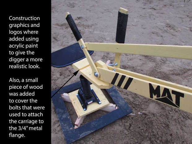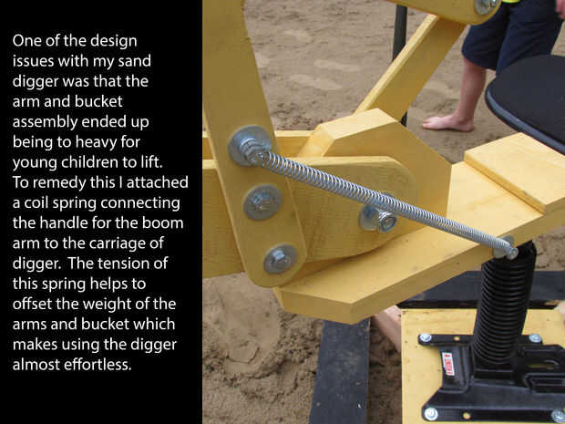 Resorte ayuda. Tiendo a construir más cosas y este proyecto no fue la excepción. He construido con mi sobrino de 5 años en mente y lamentablemente cuando fue a funcionarla que podría apenas levantar el cubo de la tierra. Tan para fijar el problema he añadido un muelle asistir a la varilla colocando un muelle en espiral resistente entre la palanca de brazo del auge y el carro. esta primavera ayuda a contrarrestar el peso de los brazos de palo y la botavara y le permite fácilmente levantar y maniobrar la excavadora.