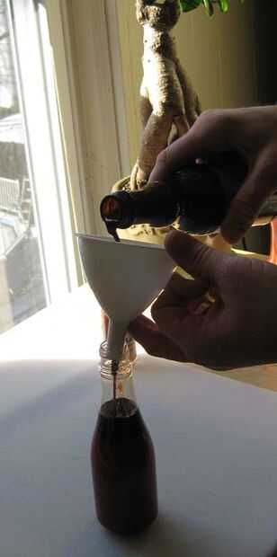 Utilice un embudo para guardar la cubierta. Si intenta utilizar reductor de orificio incorporado de la botella (lo que lo hace "escupa" pequeños pedacitos) luego haces un lío y habrá que esperar para siempre. Si usted está usando las marcas de "lujo" que tienen el reductor de orificio en la botella, pop con tenazas o un tenedor, o considerar llenar un plato pequeño de vidrio y luego transferir a la botella de cuello estrecho.