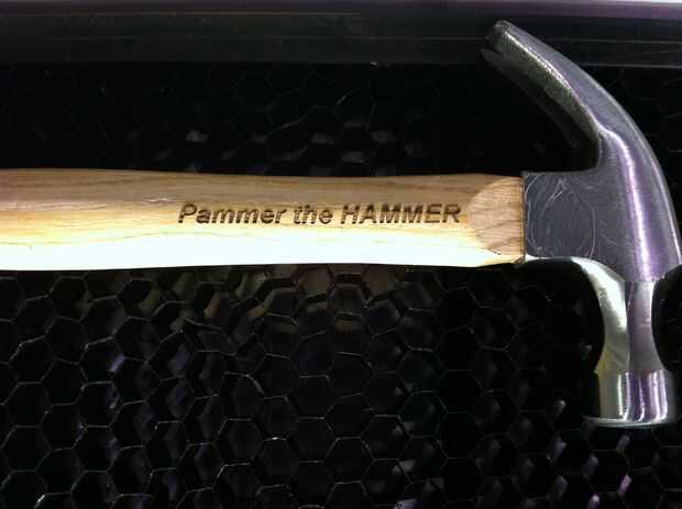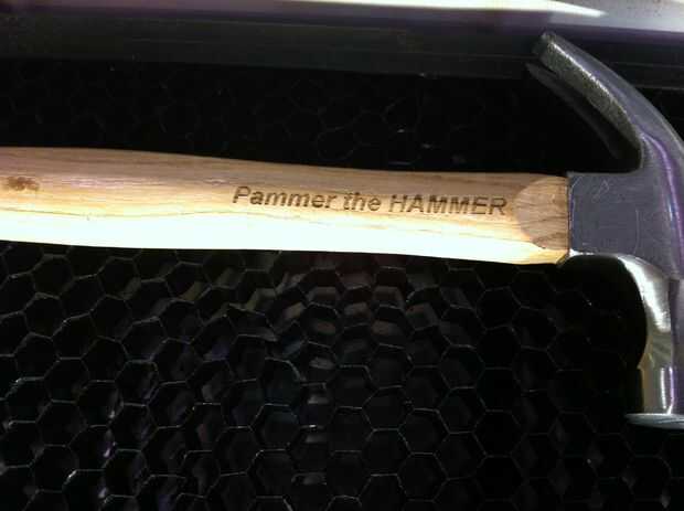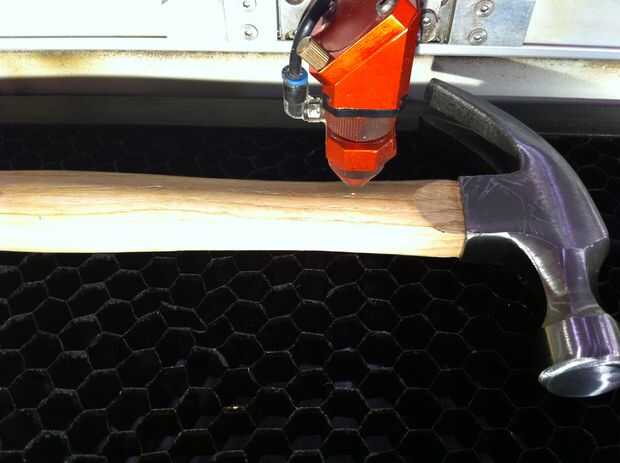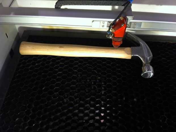 7. paso crítico - CRASH TEST: después de que ha centrado la cabeza láser, utilice el manual X / las flechas de control Y en el panel de control de Trotec para muy lentamente mueva la cabeza del láser sobre la herramienta de maneja y hace 100% seguro que una vez centrado en su grabado "área de la blanco", la cabeza del laser no en cualquier momento entrará en contacto con el mango de la herramienta o la herramienta sí mismo. En el ejemplo del martillo que grabó al agua fuerte, la cabeza de martillo asomaba por encima del plano vertical de la palanca suficientemente que el láser habría estrellado contra ella. Así que tuve que presentar mi trabajo artístico y coloque la herramienta sobre la mesa del laser para asegurarse de que la cabeza de hemmer sería a la derecha de la zona que iba a grabar, y por lo tanto no iría la cabeza láser sobre esa zona. Tenga en cuenta que después de colocar el láser para grabado y comenzar el proceso de grabado, el laser volverá al "origen" (esquina superior izquierda) de la mesa de grabado antes de mover hacia atrás a tu objetivo en el área de grabado, por lo que necesita para asegurarse de que no es ninguna parte de la herramienta que puede golpear el láser entre su área etchable y la parte superior izquierda "origen".