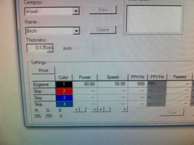 4. importar el trabajo en el área de trabajo de Control de trabajos y luego traer el cuadro de diálogo Configuración de Material de Control de trabajos. Seleccionar madera de la lista desplegable de los materiales y luego elegir el tipo adecuado de madera. Para mi proyecto, madera/abedul era un buen punto de partida, y luego ajusté la configuración y poder: 80, velocidad: 50. Consultar con los expertos de ayuda en la tienda de tecnología si no está seguro de qué configuración de potencia y velocidad, y lo ideal es hacer una prueba en un trozo de madera similar a la madera que está a punto de grabar. En caso de duda, pecar de demasiado bajo un nivel de potencia (o una muy alta velocidad). Siempre puede hacer una segunda pasada si un paso no es lo suficientemente potente, pero que no desea arruinar la pieza de trabajo o lo que es peor, provocar un incendio por ir con demasiado poder.