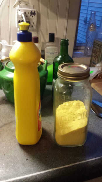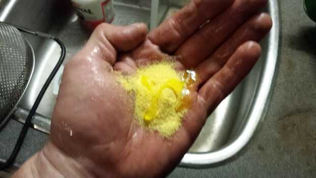 Harina de maíz y jabón. Eso es todo! Moje un lado y vierta aproximadamente una cucharada de harina de maíz en él. Agregamos una media cucharadita o menos de detergente.
