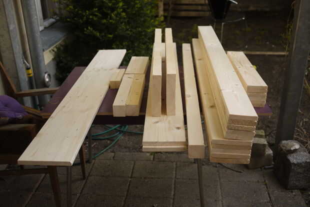 El espesor de la madera y la anchura de los listones fue dictadas a mí por la madera que podría llegar en mi almacén de hardware local (Berlín, Alemania). Si te sientes un poco mathy, podrá echar un vistazo al plan y encontrar la manera de modificar la receta para utilizar la madera que es fácil conseguir donde vives. He utilizado el pino barato más simple.