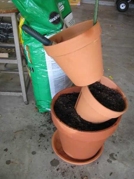 Las flores de la planta en los 8" que se inclina la olla. Añadir a continuación el segundo bote que se inclina en la estaca. Este bote debe inclinarse 180 grados en la dirección opuesta de la olla debajo de él y debe apoyarse en el borde del debajo de él.