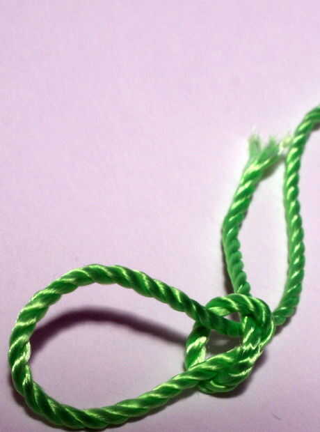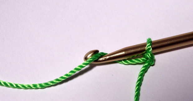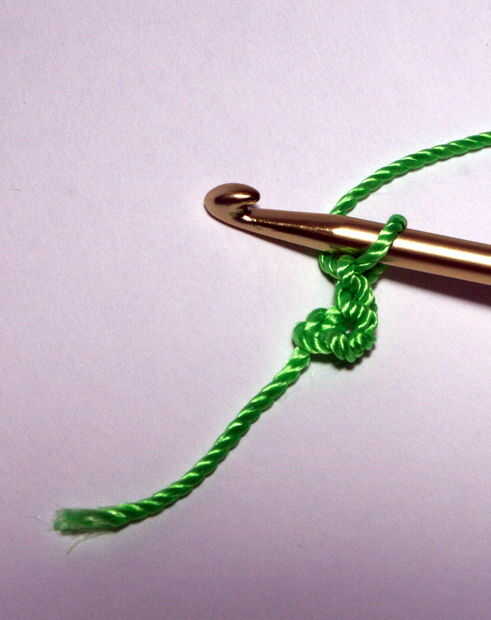 Un nudo deslizante en el extremo de su string. Introduzca el ganchillo a través y tire alguna cadena a su primera puntada. Hacer un par de puntadas (sólo 2 o 3 en total) en una línea, luego alrededor del lazo y unirse al círculo.