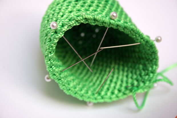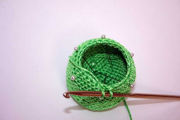 Trabajo la disminución en un hexágono por saltar puntadas cada 1/6 de la manera alrededor. Marqué mi 1/6ta con los pernos como se muestra. Pare antes de que has cerrado fuera demasiado lejos.