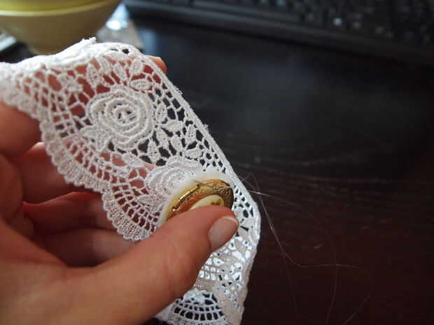 Ahora que el medallón está seco y firmemente pegado al fieltro, se puede coser en la pulsera. Utiliza el hilo claro otra vez a coser alrededor y sobre el cordón.