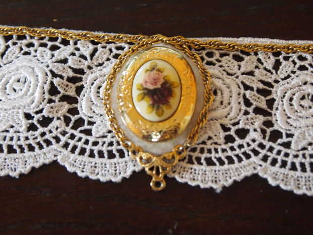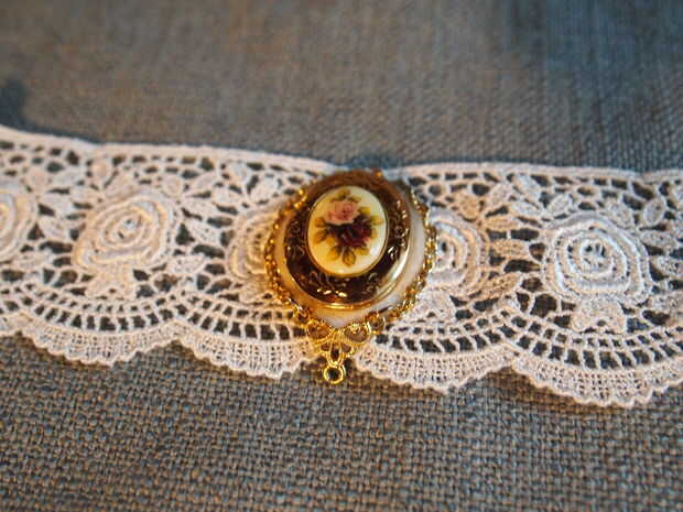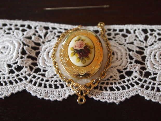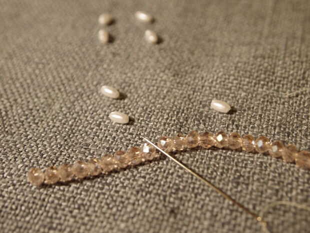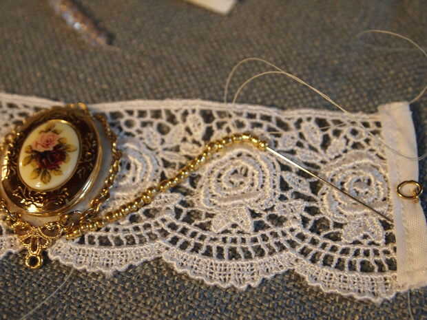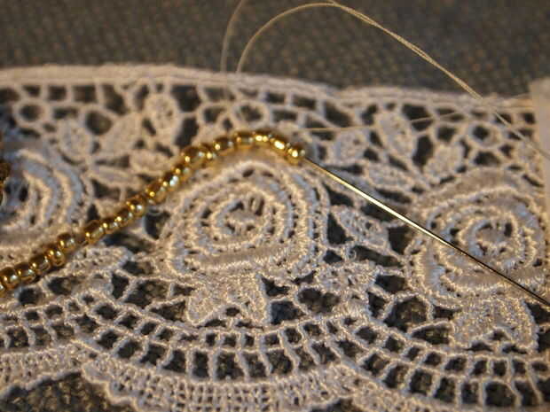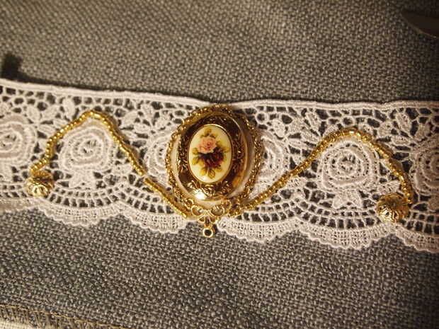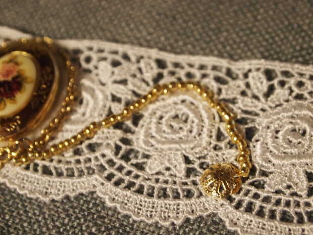 Una vez que se hizo, decidí utilizar granos de oro también para crear un diseño simple alrededor de los dos pétalos de rosa a los lados de la pulsera. Lo hice por abalorios unos 5 granos, a continuación, asegurándolo por coser el encaje. Luego, continuó abalorios más y así sucesivamente. Tuve otro pequeño adorno que era de oro y parecía una pequeña flor - así que dejé los granos allí.