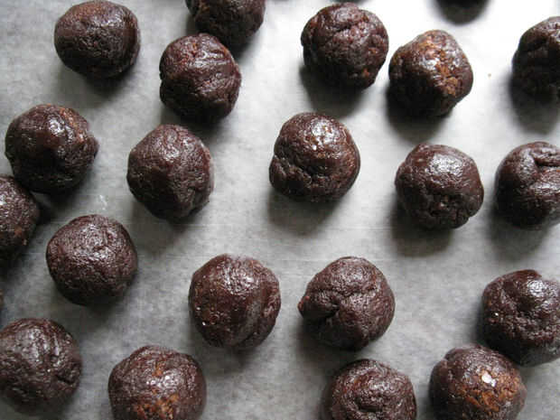 Con cuchara cucharada a una cucharada llena de brownie cocido y ligeramente el rodillo en una bola entre tus palmas y lugar en papel encerado para hornear cubierto.
