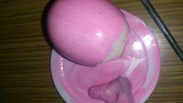 Aquí la figura muestra los huevos pintados. Prepare unos huevos extras en caso de que algunos de ellos rompen. Los ojos pintados con el mismo método pero con un pincel más pequeño.