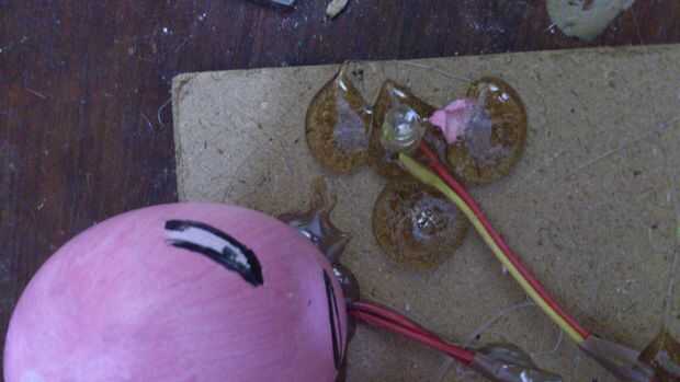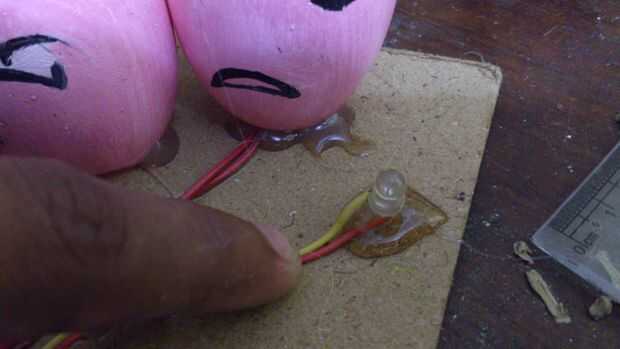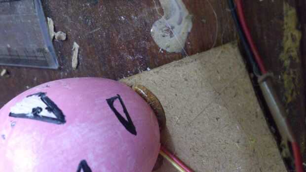 Coloque tres gotas de pegamento caliente alrededor del led para el huevo.