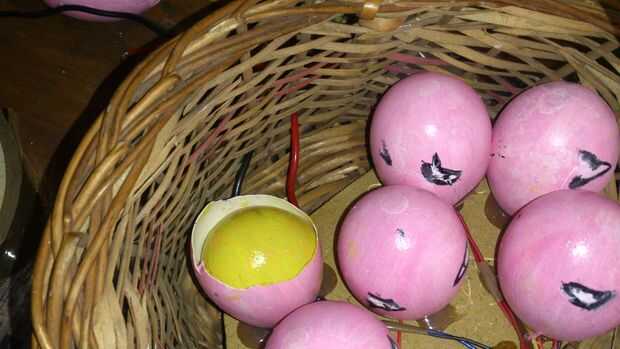 Este es el producto final con los huevos en la cesta. Necesita llenar la cesta con algunos elementos decorativos para ocultar los cables funcionando a través de la cesta. La siguiente muestra los huevos iluminados en la luz y la figura final los huevos por la noche.