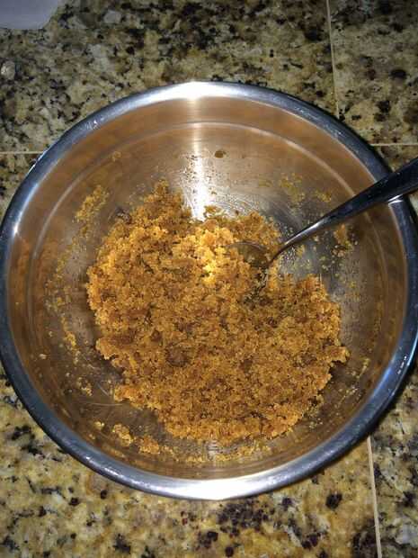 • Mezclar hasta que toda el miel y aceite de oliva está cubierto uniformemente en el azúcar moreno.