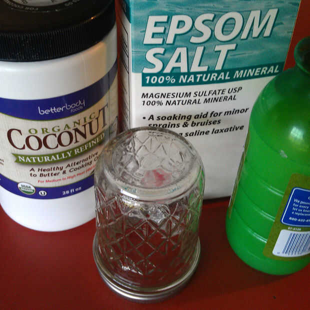 Aceite de coco y jugo de limón embotellado cocina ingredientes que se encuentran en tiendas de abarrotes. También se podría utilizar el jugo de limón fresco, pero el jugo de limón embotellado podría dar su matorral de mano una vida útil más larga. Sal de Epson es un mineral natural que se utiliza a menudo en remojos de pies caliente. Compruebe su tienda local de drogas. Funcionará cualquier bonito recipiente con una tapa hermética. A menudo usar pequeños frascos para conservas. Elegir un frasco que se mantenga cuatro onzas para esta receta, o ajustar la receta para un frasco de tamaño diferentes.