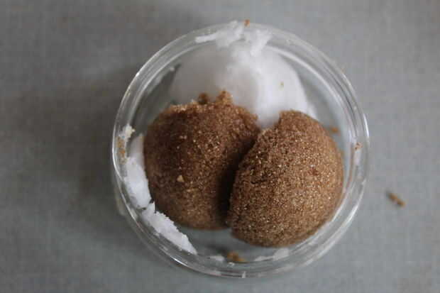 Triturar el azúcar y el aceite de coco junto y un poco de mezcla.