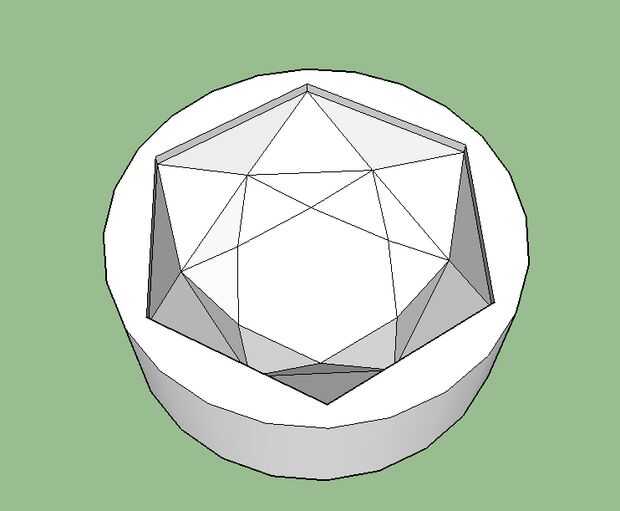 En primer lugar, he creado un molde usando SketchUp. La idea básica es establecer 3 hexágonos superpuestos, con la mitad de un ángulo levemente diferentemente que los dos exteriores. Luego uso líneas para conectar las esquinas del hexágono y utilice la herramienta mover para tirar de él hacia arriba, una capa a la vez, en el eje azul. Aquí es donde encontré los pasos para hacer este proceso si no estaba lo suficientemente clara. Sin embargo, Inspector de sólida, la extensión de SketchUp que uso para asegurarse de que todos los objetos son sólidos decidió quejarse. Así, después de mucho pensamiento y jugando he arreglado el problema. En primer lugar, sellé el círculo abierto en la parte inferior de mi molde. La utilicé la herramienta extrusión para tirar ese círculo fue revelado a través de mi joya hasta agujero. Después de guardar como un archivo .stl así que pude hacer en un archivo de .thing para la impresora, me 3D impreso en MakerBot replicator de nuestra Universidad. Escala el molde en el archivo stl 61% por lo que era el tamaño adecuado. Se atan las 2 fotos de progreso, el archivo skp para el molde y el archivo stl así.