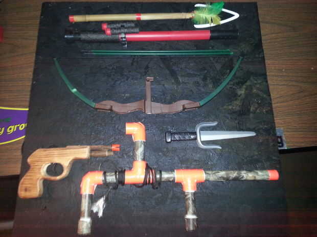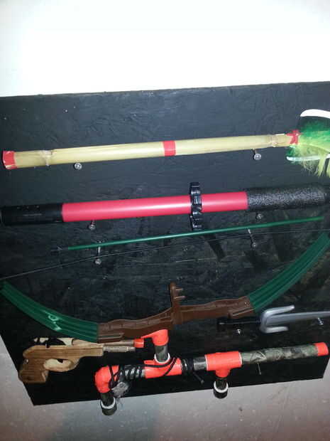 Yo tenía un montón de armas de juguete colocación alrededor de algunos hice algunos compré planeo hacer todas las armas de alguna forma u otra que eventualmente agregaré a esto. La madera que utilicé fue la madera contrachapada. Pieza de 2 pies por 2 pies. He añadido algunos tornillos y pintura y es bastante. Dependiendo de donde usted mano determinará cómo usted colgará. Tengo un arco y flecha, pistola, pistola de goma, pistola tiro de malvavisco y una lanza. Asegúrese de que sus tornillos son lo suficientemente largos para mantener todas tus cosas. Creo que le queda mejor cuando todos los tornillos son los mismos. usted podría elegir a pintar si quieres.