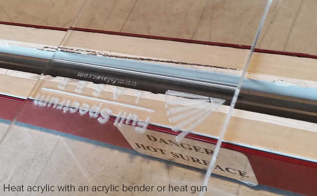 Estamos utilizando un calentador de tira para calentar una sección de precisión de acrílico, aunque una pistola de calor generará suficiente calor para doblar fácilmente el acrílico.
