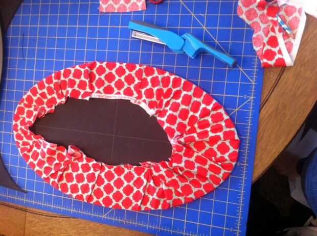 Corté una pieza de tela con cerca de diez pulgadas extras tanto horizontal como verticalmente. Puesto que mi tela tenía una impresión, que quería asegurarse de que era así que hice las directrices en el lado de núcleo de espuma (la espalda). Después de rociar la parte de corcho I establecido en la parte posterior de la tela y alineados a las directrices a ser cuadrado. El acto de tirar de la tela le da margen para hacer los ajustes necesarios. Empecé en la sección corto tirando uniformemente y asegure a la tela con una grapadora abierta. Pensé que una pistola de grapas overkill, no mencionar a perforar a través de dos capas de espuma y corcho. Yo hice mi manera alrededor del óvalo cambiar lados mantener todo como incluso como sea posible y conseguir la tela con grapas. Luego recortar a la tela y volver a montar el espejo. El grosor adicional de la tela resultada para ser insignificante.