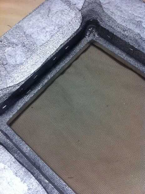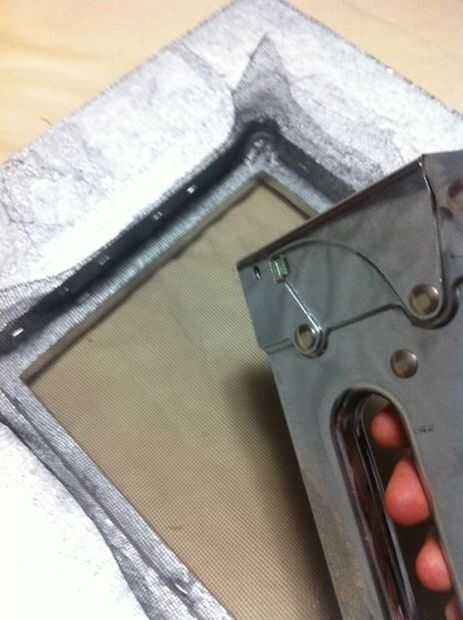 Estirar la malla en la parte posterior del marco cuadrado corté un pedazo con cerca de cuatro pulgadas en ambas direcciones. Puesto que la malla era algo estirable empecé por la perforación de una fila a lo largo de un borde. Entonces con grapas en el medio del lado opuesto y continuó estirar la pantalla uniformemente (similar a la que se extiende un lienzo) engrapado en el centro de los otros dos lados y trabajando mi camino a las esquinas. Por último, había recortado la malla sobrante.