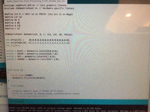 -Ahora que todo el conjunto del dispositivo se ha hecho, ahora es tiempo de escribir el código. En primer lugar, vamos a empezar a escribir código en el proceso, creando un archivo de pde. Esencialmente, lo que el código que vas a escribir va a hacer es tomar una entrada de audio de la computadora, que va a ser una canción o sonido que se reproduce, y transcribir en una serie de olas que puede graficar. La manera en que esto se puede hacer es a través de la teoría de las transformaciones rápidas de Fourier. Esencialmente, lo que esta teoría dice que las ondas sonoras puede interpretadas con un algoritmo y transformadas en ondas seno y coseno limpiamos y fácilmente graphable. Por suerte, en el programa que estamos utilizando funciones ya han sido creadas para ayudarnos a conseguir más allá de que este complejo algoritmo el código a mano. Si quieres aprender más sobre esta idea leen http://mathworld.wolfram.com/FastFourierTransform.html. A continuación, la información que se encuentra hacia fuera en el código de procesamiento va a ser enviadas al código de Arduino, que en esta entrada y crea una matriz que debe ser exhibido en la pantalla. En el código de Arduino, que tiene una extensión de archivo de ino, múltiples casos se van a esbozarse, con algunas alturas y colores relacionados con una cierta onda que se da el código. Uso de las bibliotecas que importamos antes, vamos a dibujar líneas en el tablero con un intervalo de actualización rápida, para retratar las diferentes olas que crea el sonido. A continuación se inicia un marco del código, con algunas de las piezas básicas para usted. Si te quedas atascado durante este paso, asegúrese de buscar en la biblioteca de funciones que pueden ser de uso, así como la documentación de la lengua c, si no está seguro de la sintaxis.