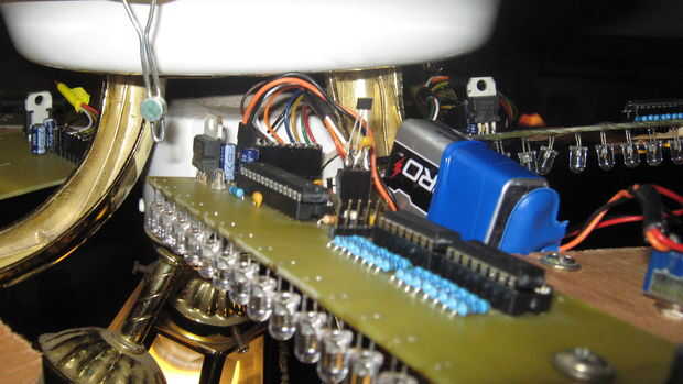 Un mazo pequeño fue hecho para conectar las tablas. Un solo micro controlador y batería ejecutan todas las cinco hojas. Finalmente voy a poder con un montaje del anillo colector o una batería en cada hoja. Un interruptor de efecto hall se usa para activar la sincronización que pasa a través de un imán de una vez por giro.