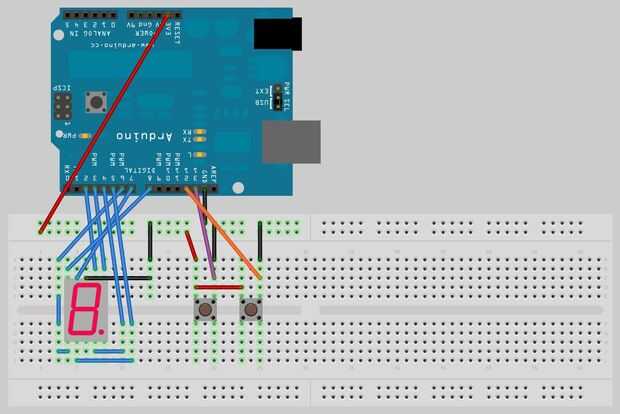 Este paso trata de controlar la pantalla con 2 botones para contar hacia arriba y hacia abajo. El esquema que se puede ver aquí abajo es muy sencillo. He conectado los pines del segmento (de A G) en Arduino (Pin 2 a 8) y los botones de lectura pasa a través de Arduino Pin 13 (cuenta) y el Pin 12 (cuenta regresiva).
