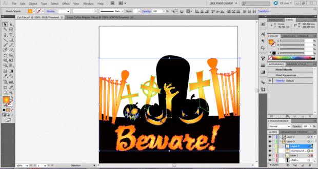 Por último, para conservar el contraste, esta pieza tiene secciones que son brillante acrílico y piezas que no que lo lograremos por aguafuerte las secciones que queremos brillar. Actualmente sólo las características calabaza brillan y eso no es suficiente "pop" así que vamos a añadir las cruces, cerca y zombie del brazo. Seleccione en la obra de arte y cambiar sus colores para que coincida con las calabazas para que veáis el efecto. También puede añadir texto o arte a la tierra para reforzar la cantidad de brillo, o agregar un nombre a la tumba. Este paso le ayuda a visualizar el producto final y le da algo para usar como guía para los dos pasos siguientes - averiguar las rutas cortadas y averiguar el grabado.