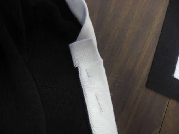 En primer lugar, abrir el suéter y alinee los dobladillos de abajo. La marca que desea que la parte inferior del cuello para iniciar con un alfiler. Asegúrese de marcar ambos lados del suéter de apertura para que la V sea incluso! Ahora, marque la parte superior de la V a lo largo del collar. Idealmente, el vestido hará que una línea recta de donde el cuello se une con la costura del hombro hasta el punto que marcó como la parte inferior. Esto llamo la V-line. Quería más de una cucharada femenina, así que hice la parte inferior de la V mucho más bajo que la versión de la película. Marque esta línea con unas pinzas rectas.