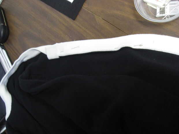 Con los puntos superior e inferior de la V marcada, ya puede comenzar a ajustar el ajuste blanco de la tapeta en su lugar. Comience con un lado. Sostiene el pasador en la parte inferior de la V en lugar de un punto de giro, doble el borde recto por lo que está en línea con la línea V. Pin el borde en el lugar. Si cualquier punto negro mira hacia fuera hacia la parte frontal de la Jersey una vez que el borde se pliega hacia atrás, meta cuidadosamente debajo del borde y pin en su lugar.