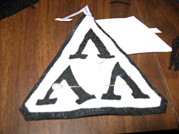 - Para Lambdas negro, recortar otro 1/4" desde cada borde del patrón de papel. Cortar el patrón de triángulo cortado en cuatro triángulos equiláteros más pequeños (piensen cortar en una Trifuerza). Dentro de uno de estos triángulos, bosquejar hacia fuera un Lambda, utilizando tu regla para hacer las líneas recta y agradable. Cortada esta lambda prender a algunos fieltro negro y corte cuidadosamente fuera de la tela. Aquí es donde agradables, limpias de líneas de fabricación realmente hará la diferencia! Las Lambdas hacia fuera del perno en la formación de la "Trifuerza", luego coser prolijamente en con hilo negro.