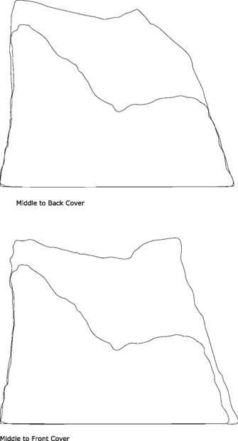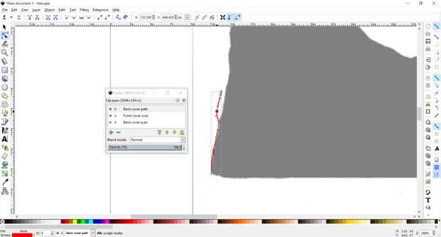 Ahora uso la herramienta de editar nodo para mover el punto o su Bézier manijas para que cada punto en la nueva versión de la ruta se ajusta a los bordes de la forma de punto medio. Luego hago lo mismo para la forma de la cubierta posterior. Cuando he terminado, ocultar o eliminar las capas con las exploraciones en ellas.