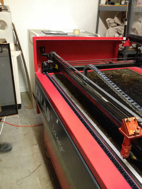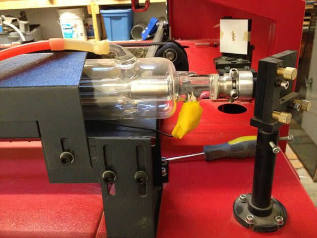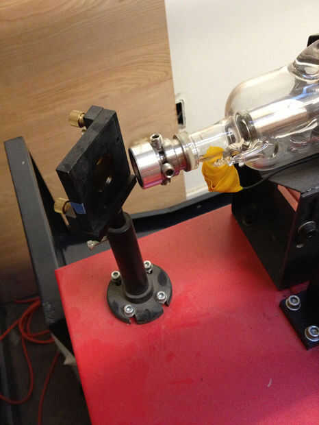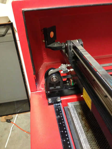 El primer espejo está en una posición en la esquina posterior izquierda de la máquina. El espejo está encerrado en una caja con un agujero circular en el frente a través del cual el espejo es visible y los tornillos de ajuste detrás. El segundo espejo está montado en el travesaño del eje Y en el lado izquierdo de la cama láser que puede ser movido desde el frente de la unidad a la muy posterior, sólo una o dos pulgadas desde el primer espejo. El carril del eje Y, de hecho, también es compatible con todo el carril de eje y cabezal de corte. (Hay un segundo carril a la derecha de la cama que soporta el otro extremo del eje X y el conjunto se mueve junto.)