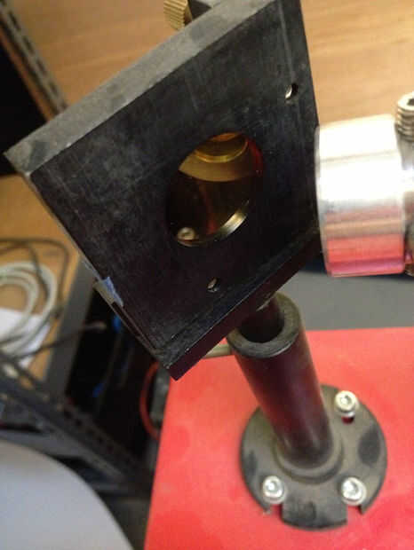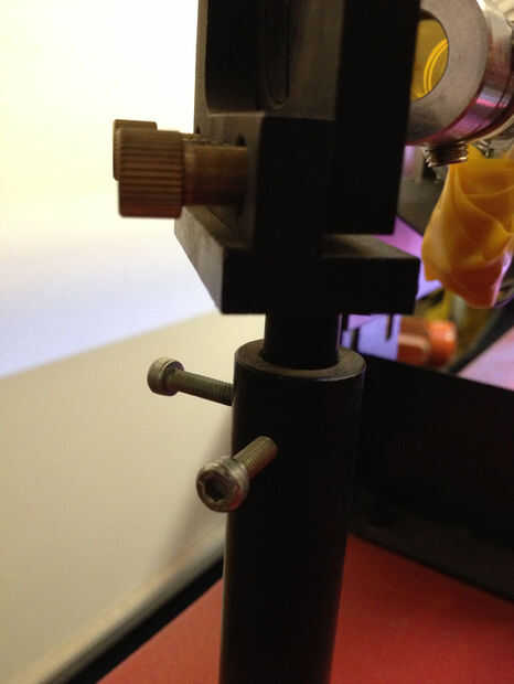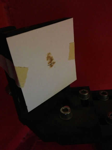 - Observar el papel en el espejo; habrá un punto pequeño, o una serie de puntos, en algún lugar sobre el papel. Idealmente debe estar en el medio. Es útil marcar estos o tomar una foto de ellos, así que pueden distinguirse las Leñas subsecuentes. Si el punto está cerca de la mitad, vamos, de lo contrario, gire los tornillos de ajuste en la parte posterior del espejo primera para cambiar su ángulo el rayo golpea más en el medio el segundo espejo y prueba otra vez.