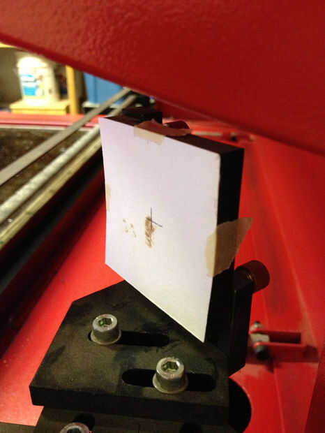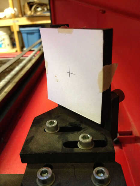 - Ajustar los tornillos en la parte posterior del espejo primera prueba como vas, hasta el punto del rayo láser es muy próxima a centrada en la parte delantera y traseras posiciones. Esto puede tomar otro pedazo de papel o dos.