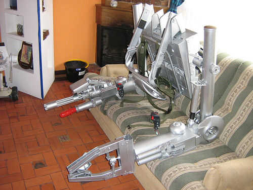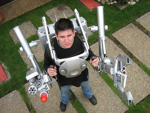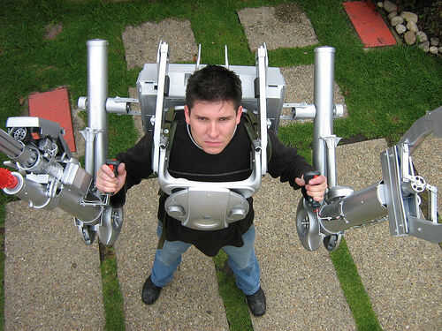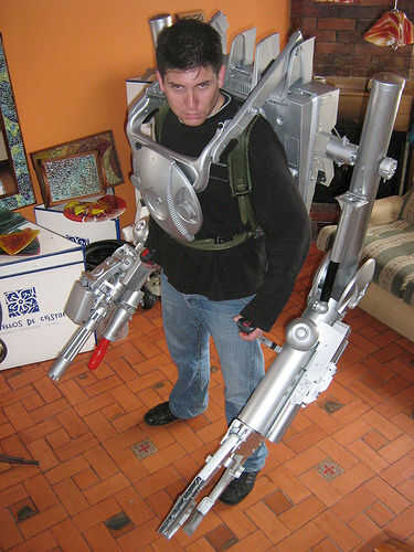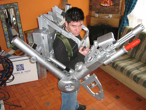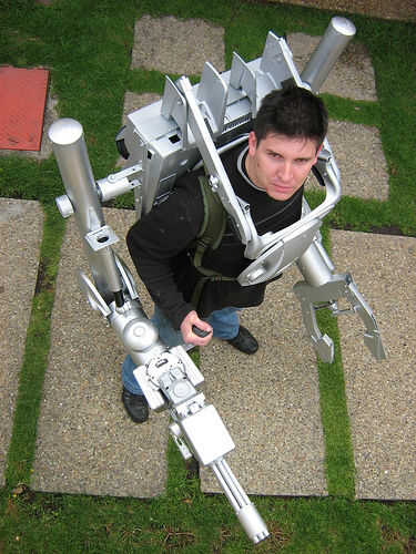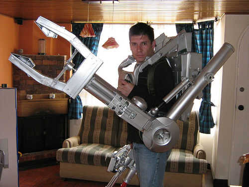 Siempre quise mi cargador de la energía, APU, exosqueleton o Battlizer de Red Power Ranger. Bueno, he construido mi propio exoesqueleto usando... BASURA!!!!!! Basura plástica que proviene de PVC tubos, una silla rota, impresora y PC piezas, mesa de bebé, una vieja máquina de escribir eléctrica y tapas de desodorante, todas ellas encuentra lanzarán en las calles de mi ciudad. Añadir un motor de coche rc eléctrico y motor de un destornillador eléctrico y palancas de mando y montar con un motortool Dremel y destornilladores eléctricos, y usted estará listo para decir "SPD, emergencia!!, destruir algunos robots o patear algunos alienígenas a tope. Y bueno, será mi disfraz de Halloween!!!!!!