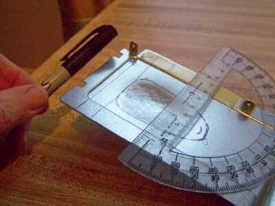 he utilizado un rotulador fino para delinear el llavero en el metal. Hice algunos golpes adicionales para caber el contorno del fob. Marqué las líneas rectas en el extremo inferior del fob. La pieza definida por estas lineas se pliega hacia arriba y alrededor de la parte inferior del fob para mantener mi escudo en el llavero, cuando está en mi carpeta de la clave.