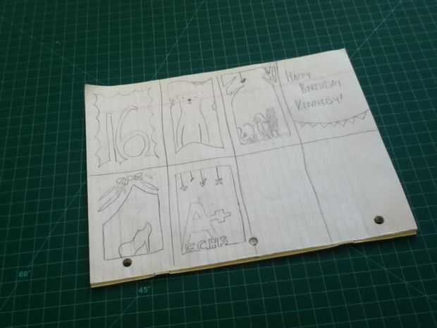 Empezar por esbozar las cinco escenas que tienes dentro de tu tarjeta, en el papel de desecho. Puede hacerlos como simple o complicado como quieras, pero recuerda, estará cortando les hacia fuera más adelante. DEBE dejar un borde alrededor de los bordes de tus imágenes, para que la tarjeta puede ser montada correctamente. También asegúrese de que los bordes de tus imágenes toquen la frontera, porque una vez más, estará cortando les hacia fuera más adelante. Usted puede Agregar la superposición de imágenes y patrones porque habrá dos 'capas' en cada escena (puede que desee dibujar dos cuadros separados para cada escena).