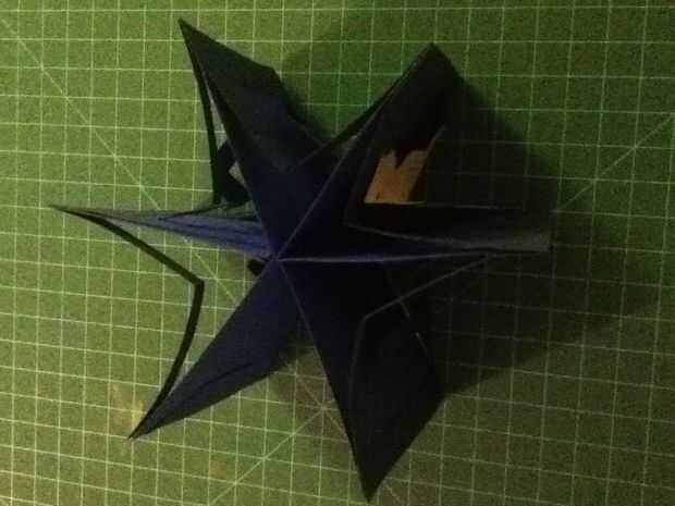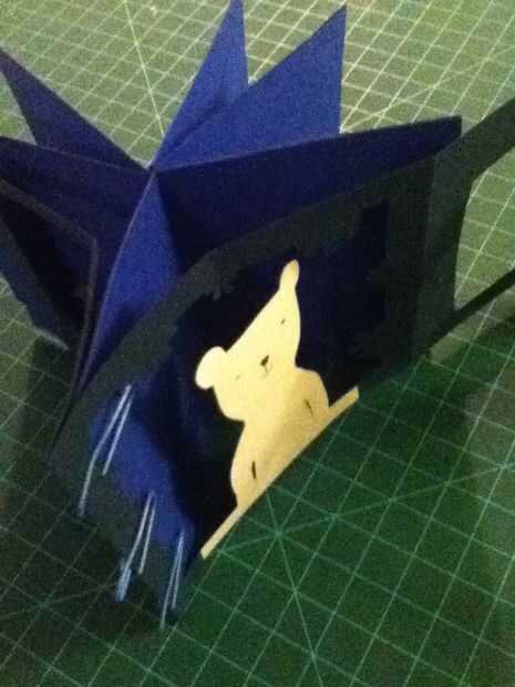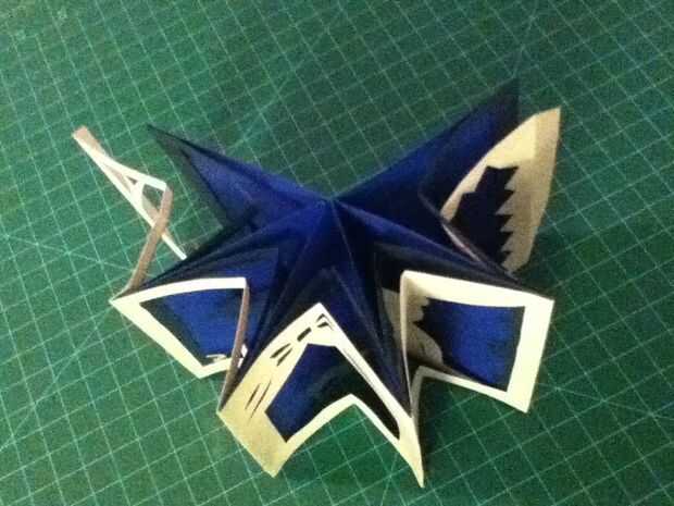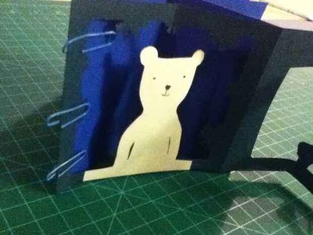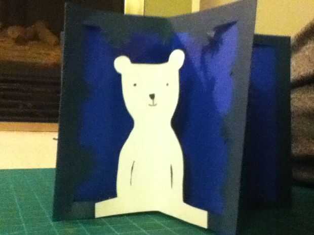 Ahora pegamento en los bordes de la segunda capa (blanco, 45 cm) de la misma manera que la primera capa, pero no pegamento hacia abajo las pestañas! Ahora debe tener una tarjeta con una base y cinco escenas con dos capas de recorte de imágenes.