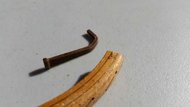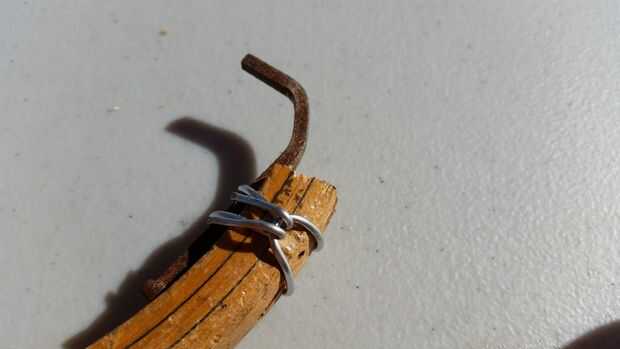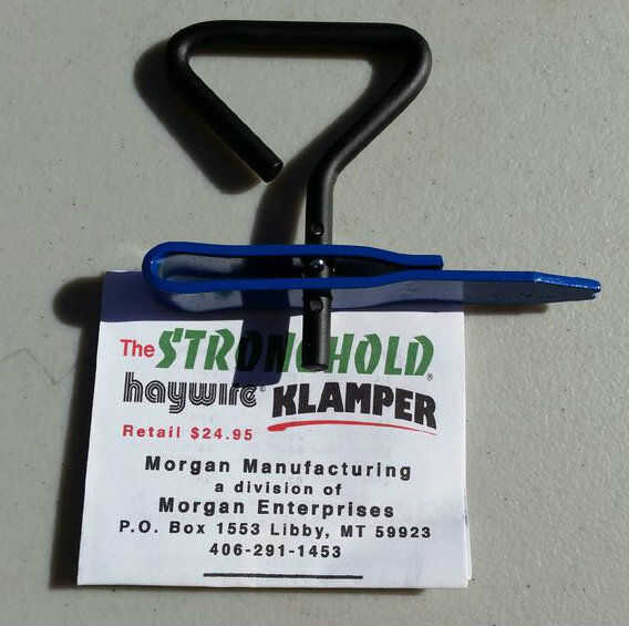 Utilicé una herramienta de fortaleza Klamper. No esta empresa propia ni siquiera conocerlas, pero tengo que decir que esta es la mejor herramienta que he tenido! Con esta cosa, usted puede sujetar cualquier cosa junto con alambre de enfardar. Toma toda la holgura de alambre, formando una pinza increíblemente apretada. Como se puede ver, sujeta el clavo doblado a la raqueta de madera. El accesorio es más allá de seguro.
