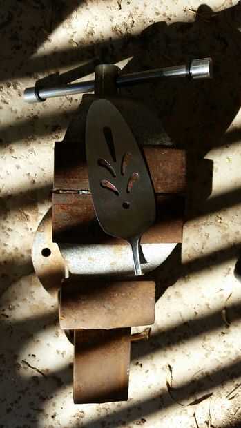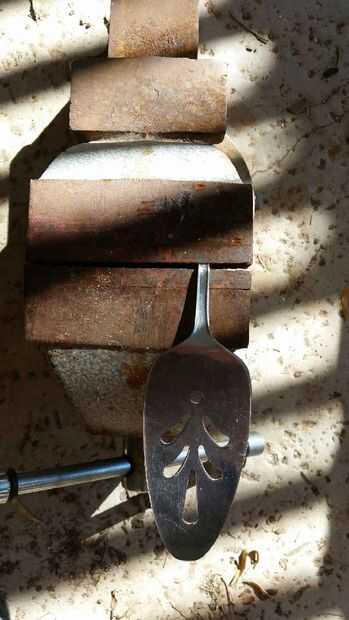 Con una mano, empecé a girar la espátula, como lo que quedaba de la manija que se basaba en el vicio. Con mi otra mano, golpeó el extremo roto de la manija con un martillo. Esta había afilada en el extremo de la manija y también le dio un efecto sacacorchos.