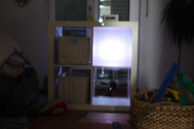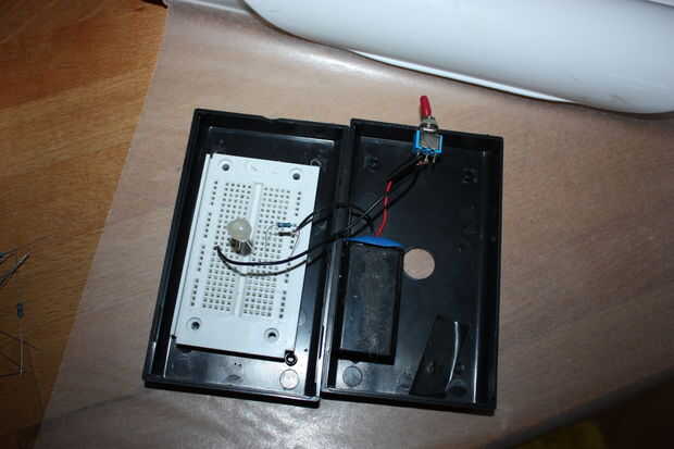 Para este paso he utilizado una caja de pequeños prototipos que hecho de piezas de repuesto. Luego he añadido uno de los LEDs difusos enganchado hasta una resistencia y enchufada una batería. Luego colocado detrás del papel de la hornada y vuelta de las luces para ver lo que sucedería.