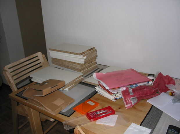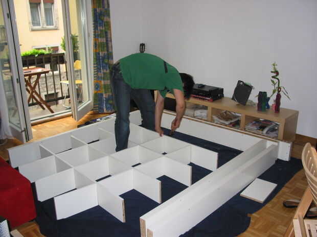 Tomamos la Expedit usado aparte y básicamente cortar cada trozo en una sierra circular a mis papás y compró una bolsa grande de clavijas (necesitarás dos veces como mucho para las dos mitades) para corregir todas las juntas verticales 30.